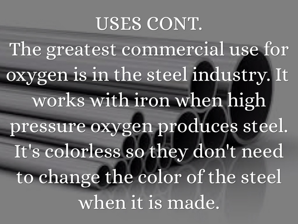 The greatest commercial use for oxygen is in the steel industry. It works with iron when high pressure oxygen produces steel. It's colorless so they don't need to change the color of the steel when it is made.