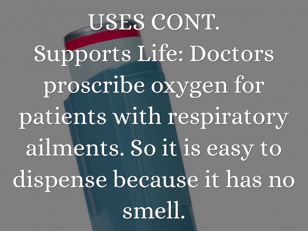 Supports Life: Doctors proscribe oxygen for patients with respiratory ailments. So it is easy to dispense because it has no smell.