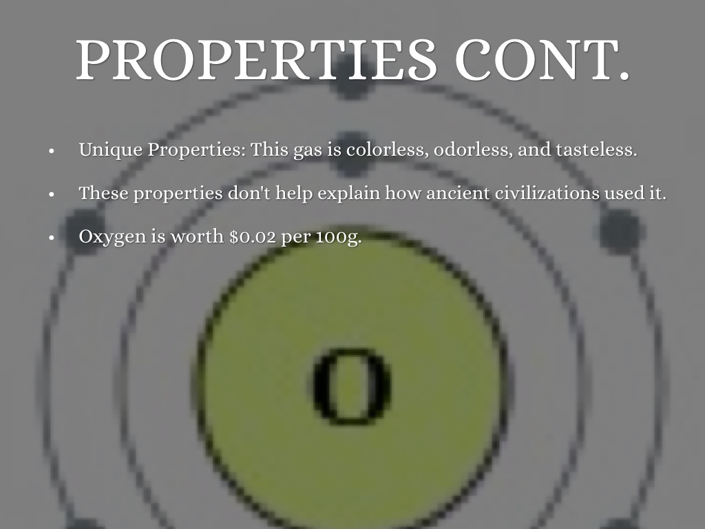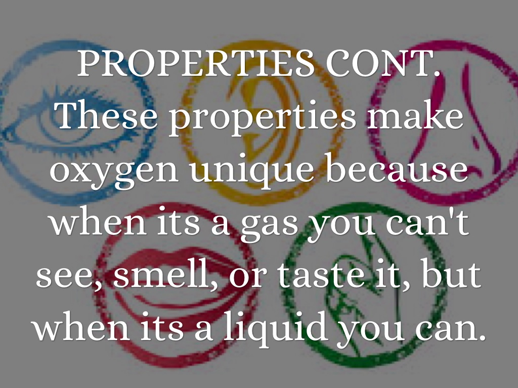 These properties make oxygen unique because when its a gas you can't see, smell, or taste it, but when its a liquid you can.