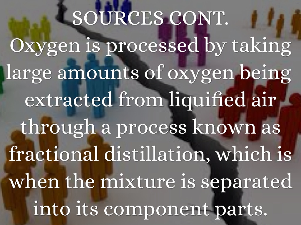 Oxygen is processed by taking large amounts of oxygen being extracted from liquified air through a process known as fractional distillation, which is when the mixture is separated into its component parts.