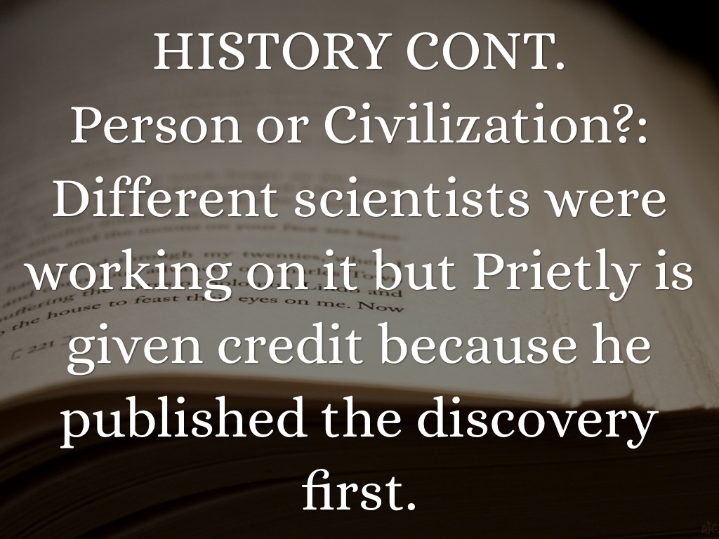 Person or Civilization?: Different scientists were working on it but Prietly is given credit because he published the discovery first.