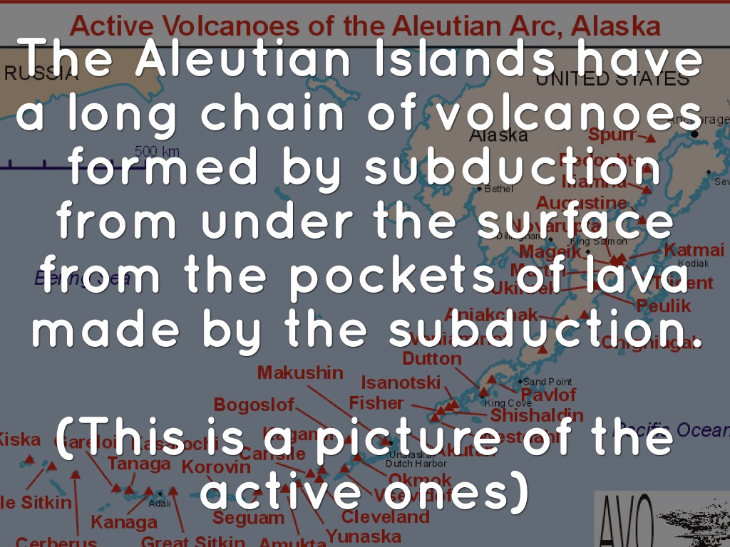 The Aleutian Islands have a long chain of volcanoes formed by subduction from under the surface from the pockets of lava made by the subduction.