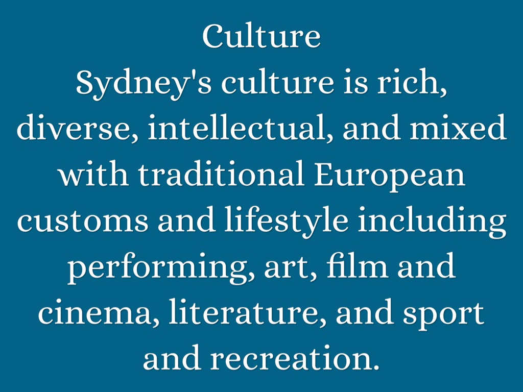 Sydney's culture is rich, diverse, intellectual, and mixed with traditional European customs and lifestyle including performing, art, film and cinema, literature, and sport and recreation.