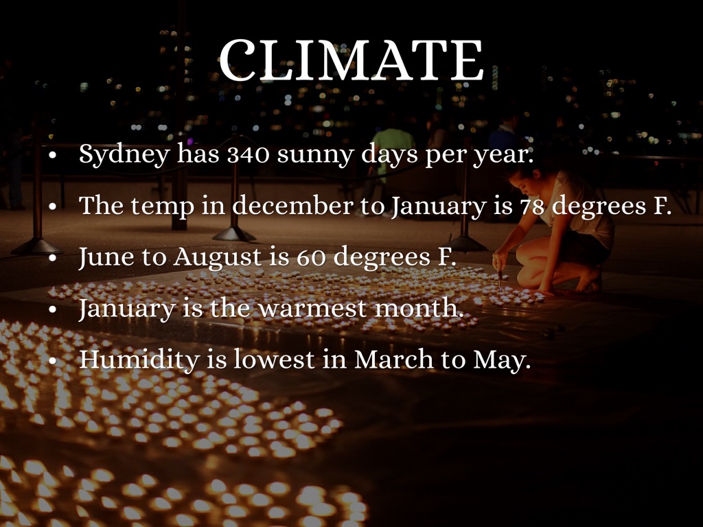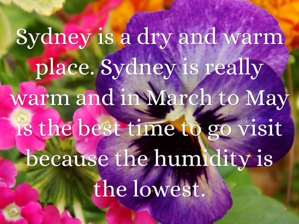 Sydney is a dry and warm place. Sydney is really warm and in March to May is the best time to go visit because the humidity is the lowest.