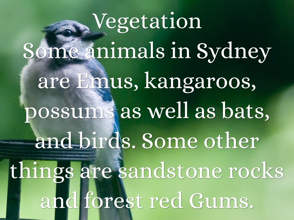 Some animals in Sydney are Emus, kangaroos, possums as well as bats, and birds. Some other things are sandstone rocks and forest red Gums.
