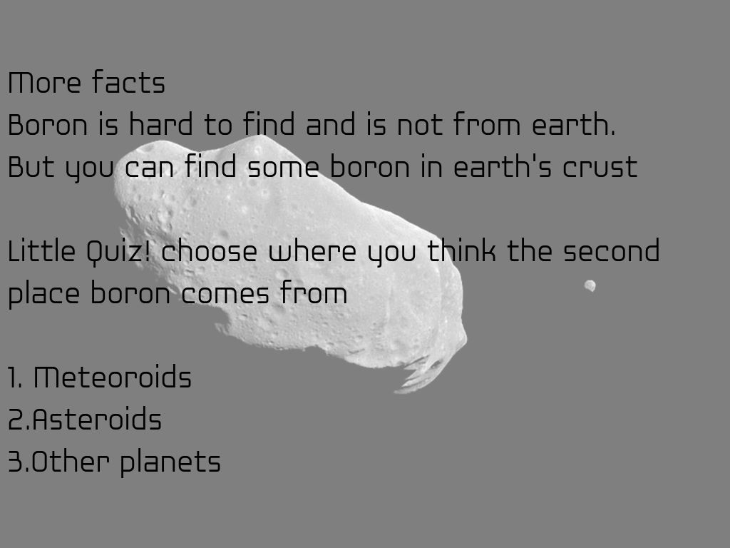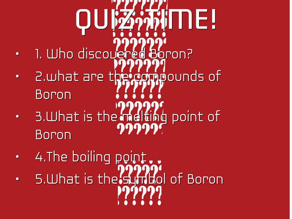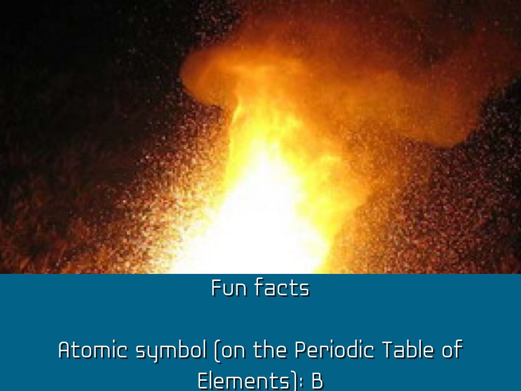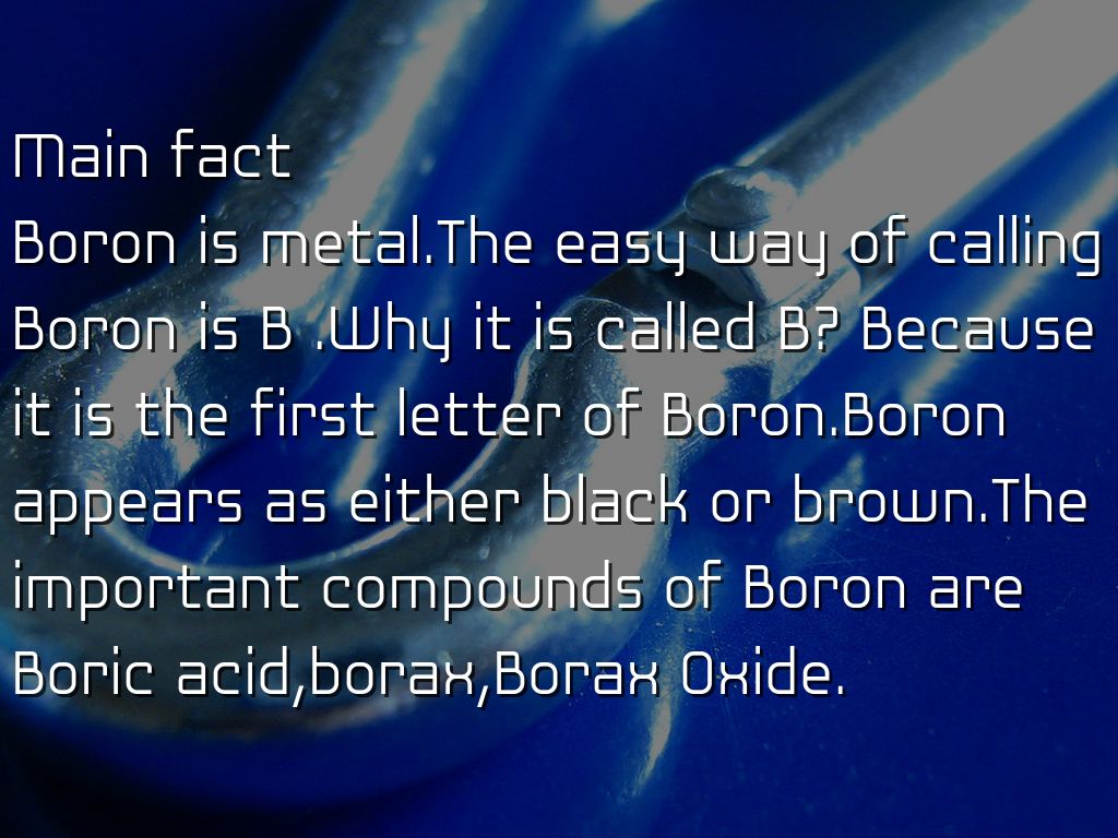 Boron is metal.The easy way of calling Boron is B .Why it is called B? Because it is the first letter of Boron.Boron appears as either black or brown.The important compounds of Boron are Boric acid,borax,Borax Oxide.