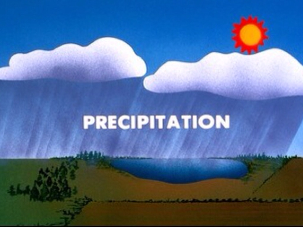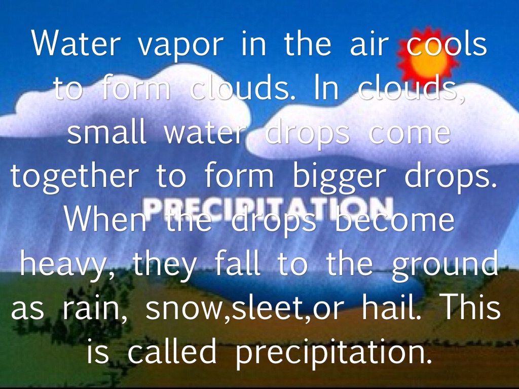 Water vapor in the air cools to form clouds. In clouds, small water drops come together to form bigger drops. When the drops become heavy, they fall to the ground as rain, snow,sleet,or hail. This is called precipitation.