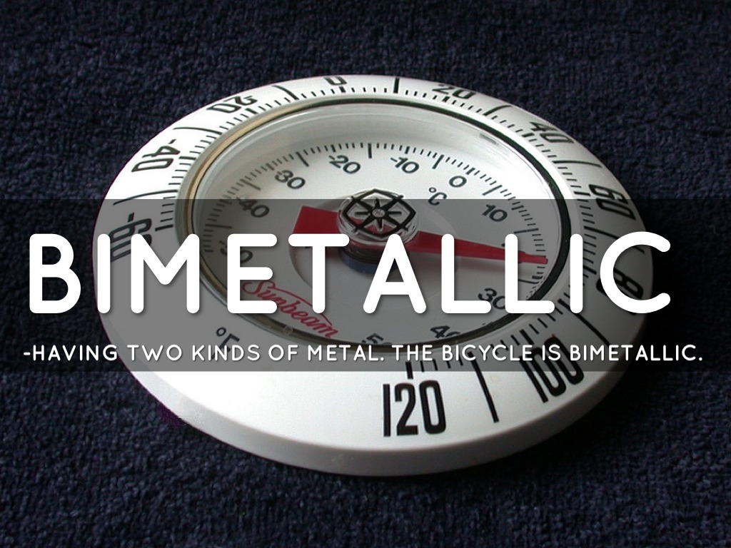-HAVING TWO KINDS OF METAL. THE BICYCLE IS BIMETALLIC.
