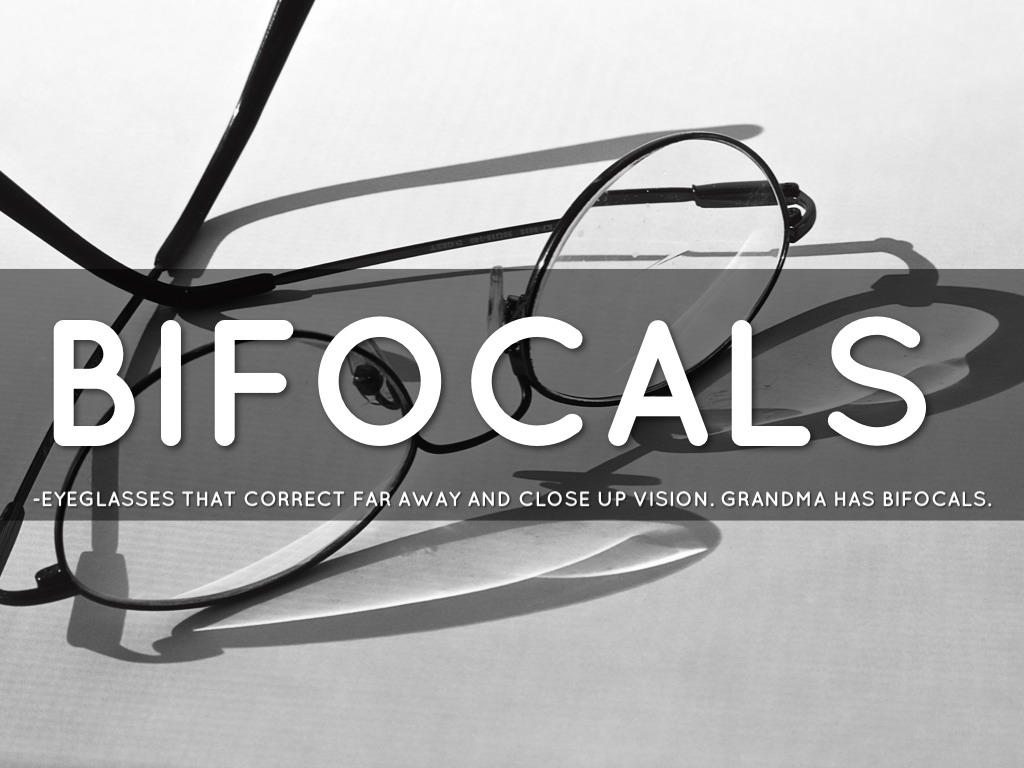 -EYEGLASSES THAT CORRECT FAR AWAY AND CLOSE UP VISION. GRANDMA HAS BIFOCALS.