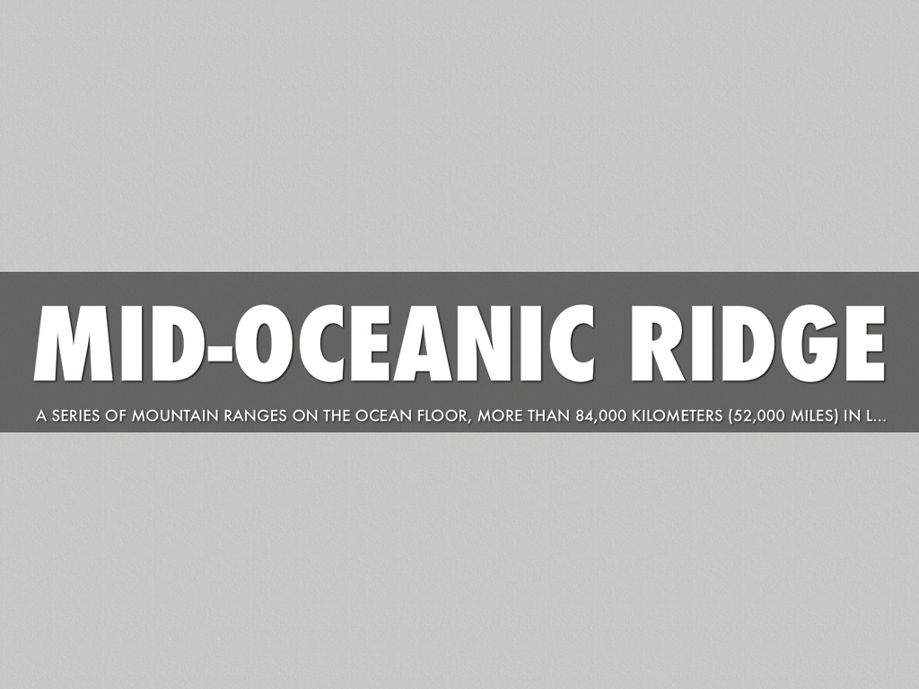 A series of mountain ranges on the ocean floor, more than 84,000 kilometers (52,000 miles) in length, extending through the North and South Atlantic, the Indian Ocean, and the South Pacific. According to the plate tectonics theory, volcanic rock is added to the sea floor as the mid-ocean ridge spreads apart.