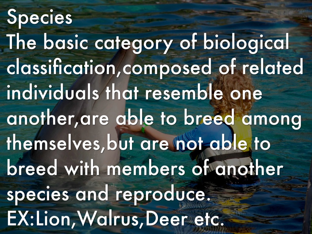 The basic category of biological classification,composed of related individuals that resemble one another,are able to breed among themselves,but are not able to breed with members of another species and reproduce.