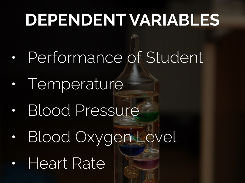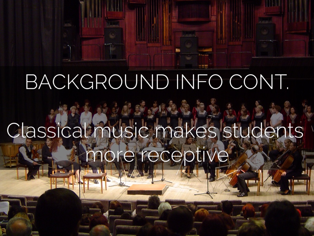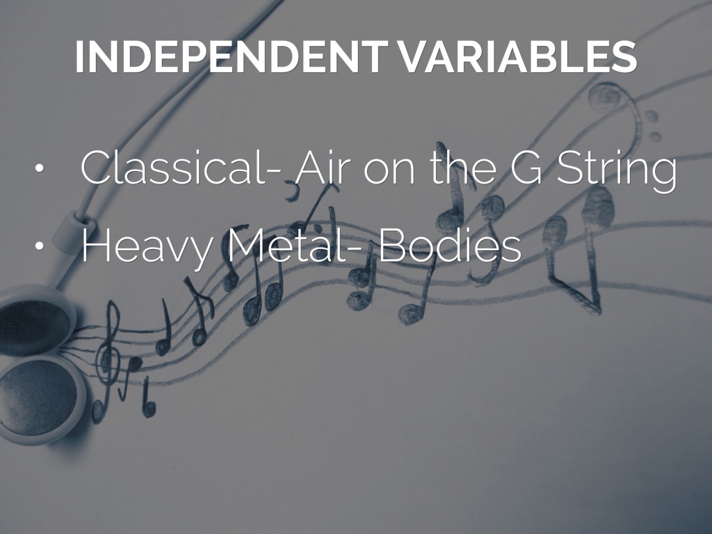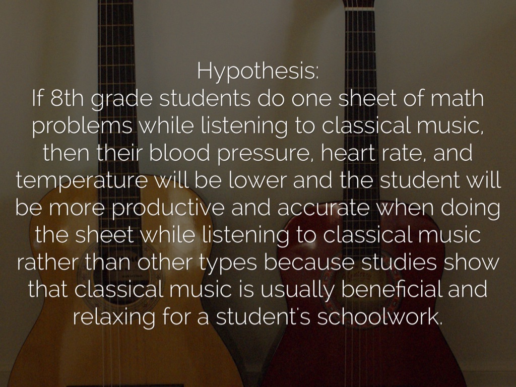 Hypothesis: If 8th grade students do one sheet of math problems while listening to classical music, then their blood pressure, heart rate, and temperature will be lower and the student will be more productive and accurate when doing the sheet while listening to classical music rather than other types because studies show that classical music is usually beneficial and relaxing for a student's schoolwork.