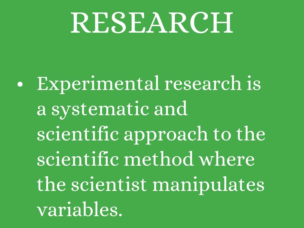 Experimental research is a systematic and scientific approach to the scientific method where the scientist manipulates variables.