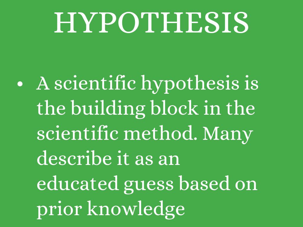 A scientific hypothesis is the building block in the scientific method. Many describe it as an educated guess based on prior knowledge