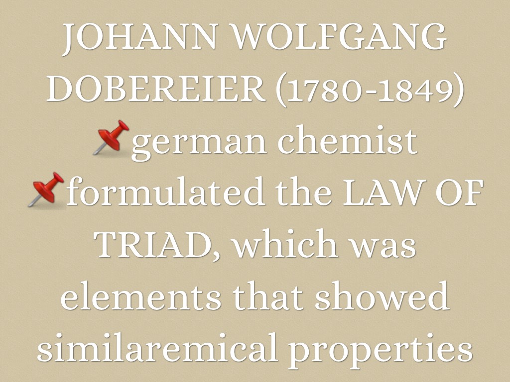 📌formulated the LAW OF TRIAD, which was elements that showed similaremical properties