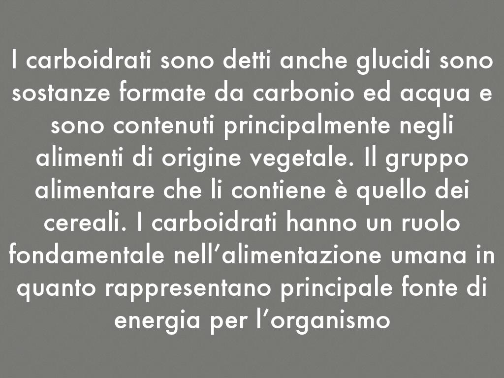 I carboidrati sono detti anche glucidi sono sostanze formate da carbonio ed acqua e sono contenuti principalmente negli alimenti di origine vegetale. Il gruppo alimentare che li contiene è quello dei cereali. I carboidrati hanno un ruolo fondamentale nell’alimentazione umana in quanto rappresentano principale fonte di energia per l’organismo