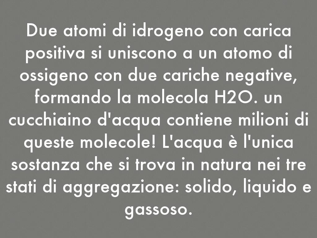 Due atomi di idrogeno con carica positiva si uniscono a un atomo di ossigeno con due cariche negative, formando la molecola H2O. un cucchiaino d'acqua contiene milioni di queste molecole! L'acqua è l'unica sostanza che si trova in natura nei tre stati di aggregazione: solido, liquido e gassoso.