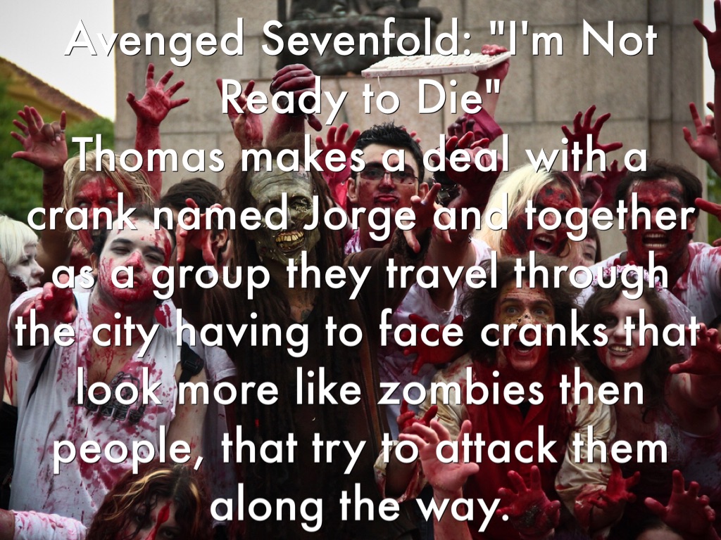 Avenged Sevenfold: "I'm Not Ready to Die" Thomas makes a deal with a crank named Jorge and together as a group they travel through the city having to face cranks that look more like zombies then people, that try to attack them along the way.