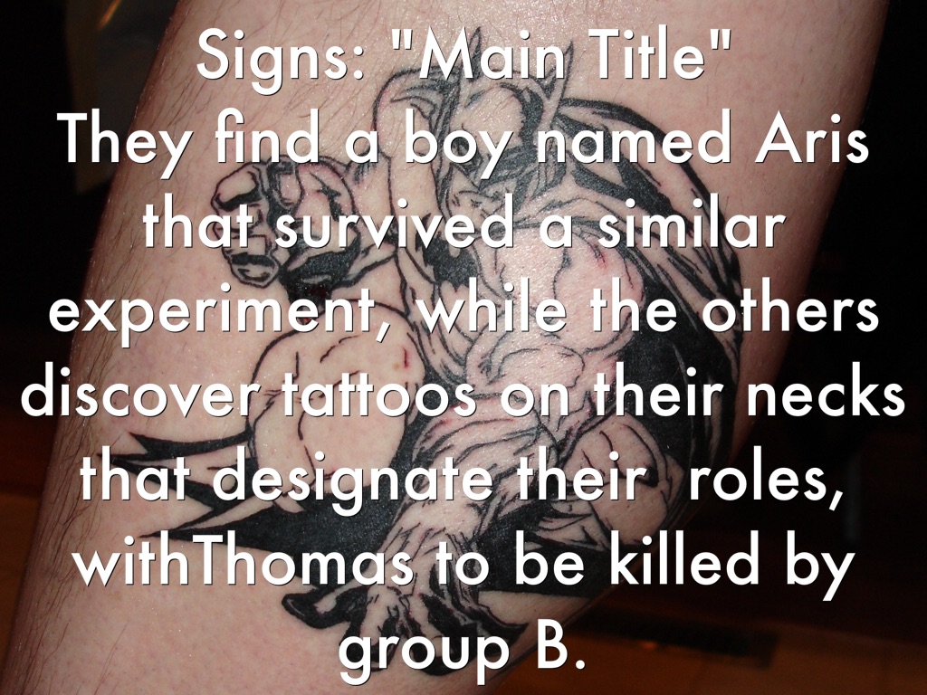 Signs: "Main Title" They find a boy named Aris that survived a similar experiment, while the others discover tattoos on their necks that designate their roles, withThomas to be killed by group B.