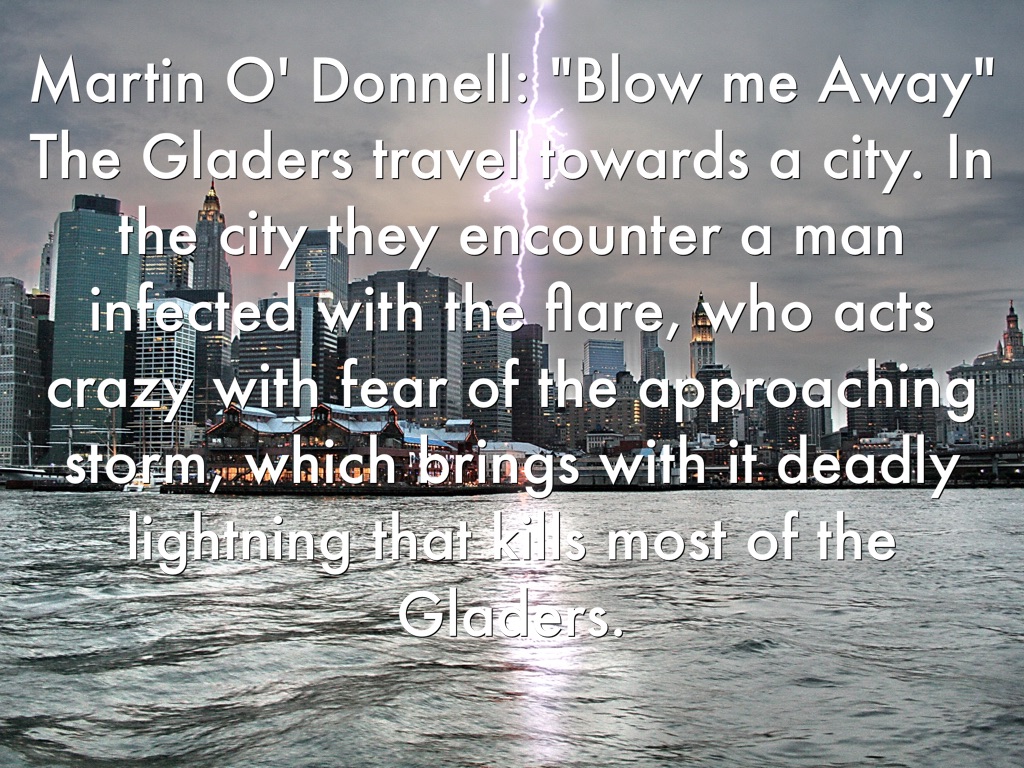 Martin O' Donnell: "Blow me Away" The Gladers travel towards a city. In the city they encounter a man infected with the flare, who acts crazy with fear of the approaching storm, which brings with it deadly lightning that kills most of the Gladers.