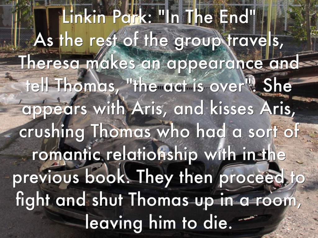 Linkin Park: "In The End" As the rest of the group travels, Theresa makes an appearance and tell Thomas, "the act is over". She appears with Aris, and kisses Aris, crushing Thomas who had a sort of romantic relationship with in the previous book. They then proceed to fight and shut Thomas up in a room, leaving him to die.