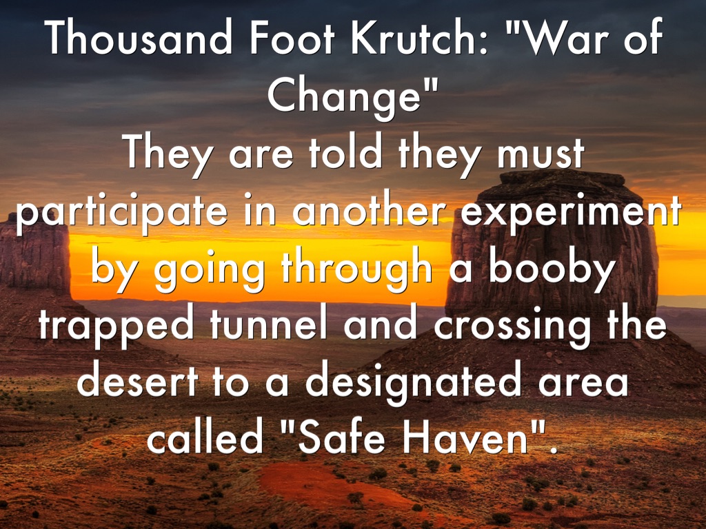 Thousand Foot Krutch: "War of Change" They are told they must participate in another experiment by going through a booby trapped tunnel and crossing the desert to a designated area called "Safe Haven".
