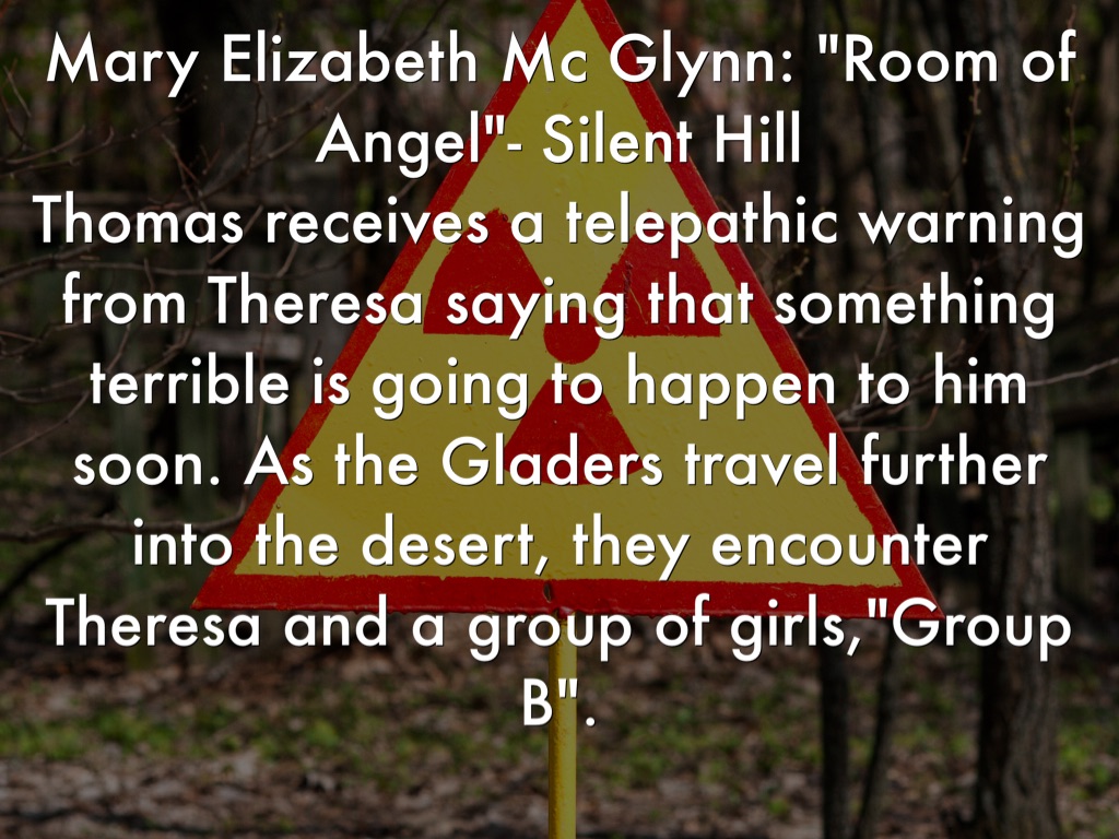 Mary Elizabeth Mc Glynn: "Room of Angel"- Silent Hill Thomas receives a telepathic warning from Theresa saying that something terrible is going to happen to him soon. As the Gladers travel further into the desert, they encounter Theresa and a group of girls,"Group B".