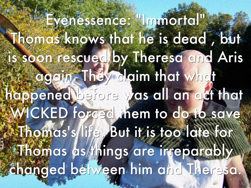 Evenessence: "Immortal" Thomas knows that he is dead , but is soon rescued by Theresa and Aris again. They claim that what happened before was all an act that WICKED forced them to do to save Thomas's life. But it is too late for Thomas as things are irreparably changed between him and Theresa.