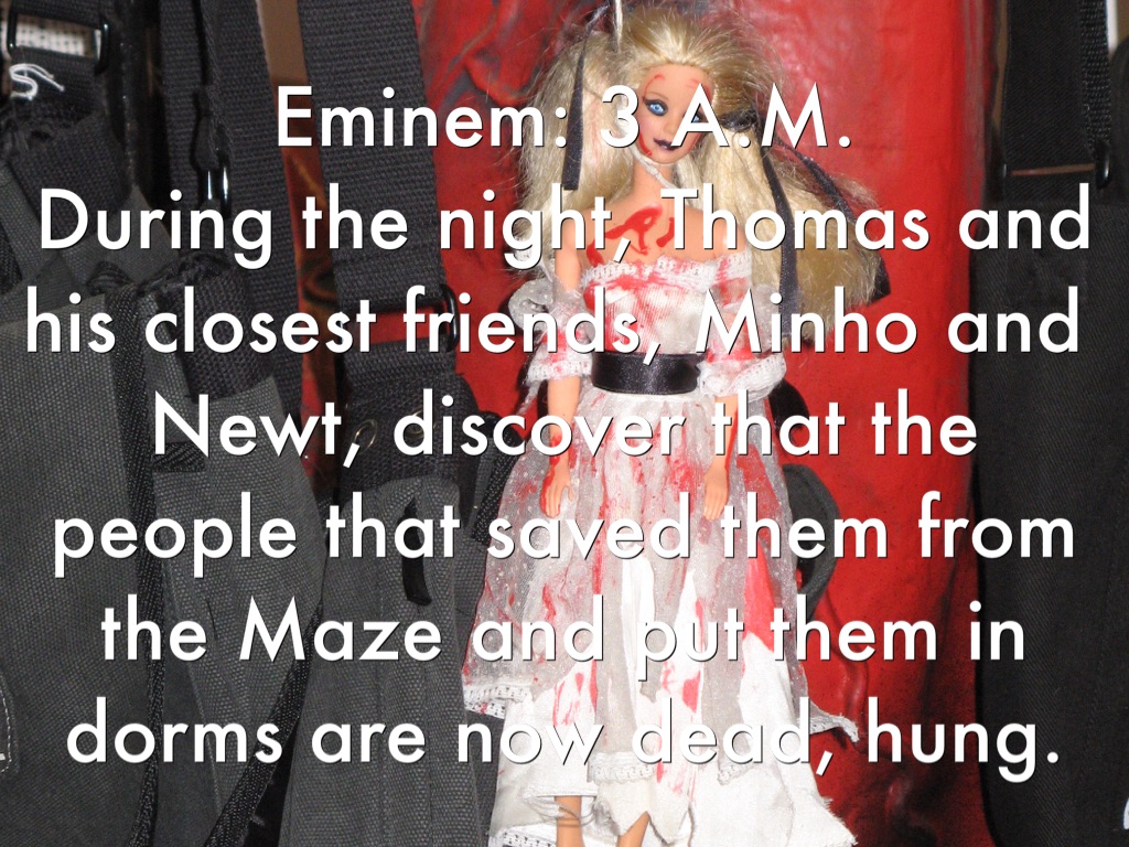 Eminem: 3 A.M. During the night, Thomas and his closest friends, Minho and Newt, discover that the people that saved them from the Maze and put them in dorms are now dead, hung.