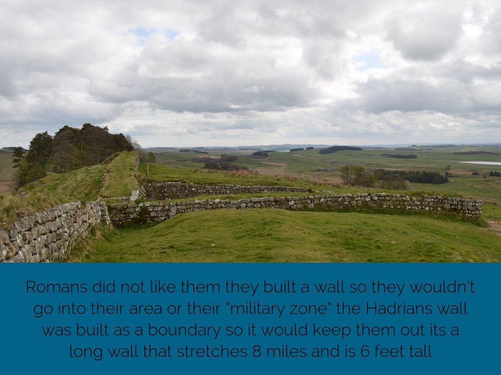 Romans did not like them they built a wall so they wouldn't go into their area or their "military zone" the Hadrians wall was built as a boundary so it would keep them out its a long wall that stretches 8 miles and is 6 feet tall