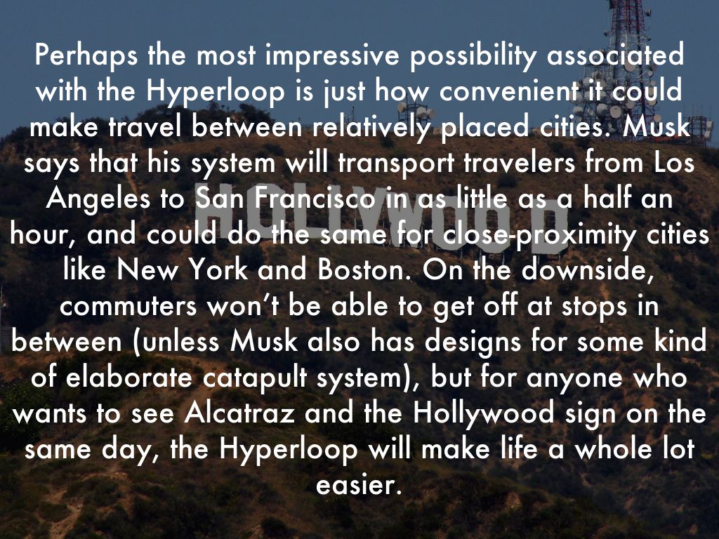 Perhaps the most impressive possibility associated with the Hyperloop is just how convenient it could make travel between relatively placed cities. Musk says that his system will transport travelers from Los Angeles to San Francisco in as little as a half an hour, and could do the same for close-proximity cities like New York and Boston. On the downside, commuters won’t be able to get off at stops in between (unless Musk also has designs for some kind of elaborate catapult system), but for anyone who wants to see Alcatraz and the Hollywood sign on the same day, the Hyperloop will make life a whole lot easier.