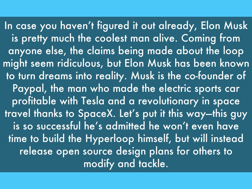In case you haven’t figured it out already, Elon Musk is pretty much the coolest man alive. Coming from anyone else, the claims being made about the loop might seem ridiculous, but Elon Musk has been known to turn dreams into reality. Musk is the co-founder of Paypal, the man who made the electric sports car profitable with Tesla and a revolutionary in space travel thanks to SpaceX. Let’s put it this way—this guy is so successful he’s admitted he won’t even have time to build the Hyperloop himself, but will instead release open source design plans for others to modify and tackle.