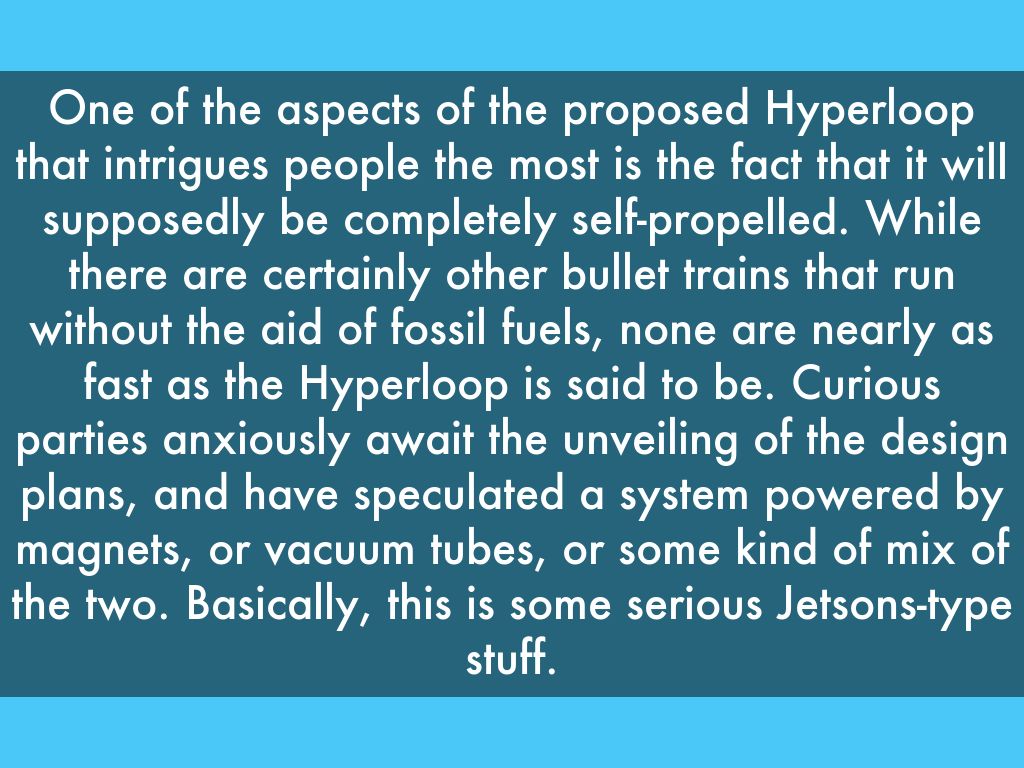One of the aspects of the proposed Hyperloop that intrigues people the most is the fact that it will supposedly be completely self-propelled. While there are certainly other bullet trains that run without the aid of fossil fuels, none are nearly as fast as the Hyperloop is said to be. Curious parties anxiously await the unveiling of the design plans, and have speculated a system powered by magnets, or vacuum tubes, or some kind of mix of the two. Basically, this is some serious Jetsons-type stuff.