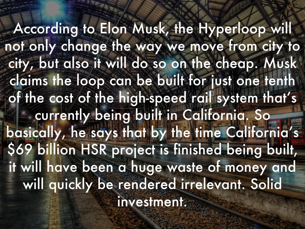 According to Elon Musk, the Hyperloop will not only change the way we move from city to city, but also it will do so on the cheap. Musk claims the loop can be built for just one tenth of the cost of the high-speed rail system that’s currently being built in California. So basically, he says that by the time California’s $69 billion HSR project is finished being built, it will have been a huge waste of money and will quickly be rendered irrelevant. Solid investment.