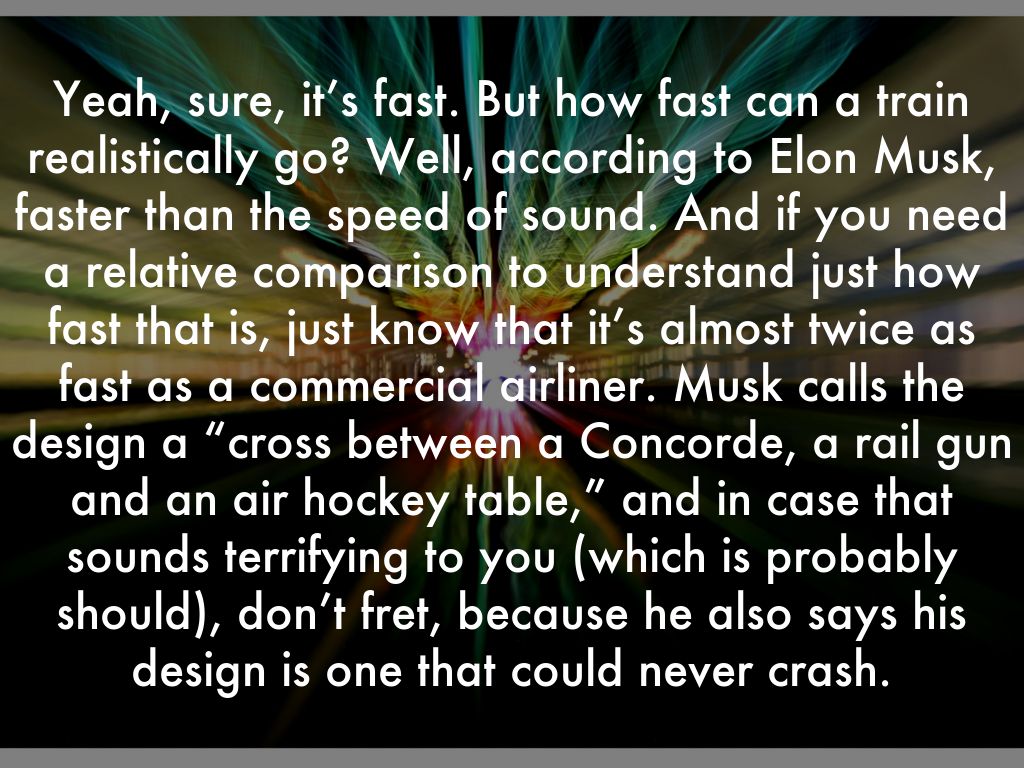 Yeah, sure, it’s fast. But how fast can a train realistically go? Well, according to Elon Musk, faster than the speed of sound. And if you need a relative comparison to understand just how fast that is, just know that it’s almost twice as fast as a commercial airliner. Musk calls the design a “cross between a Concorde, a rail gun and an air hockey table,” and in case that sounds terrifying to you (which is probably should), don’t fret, because he also says his design is one that could never crash.