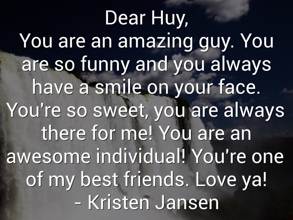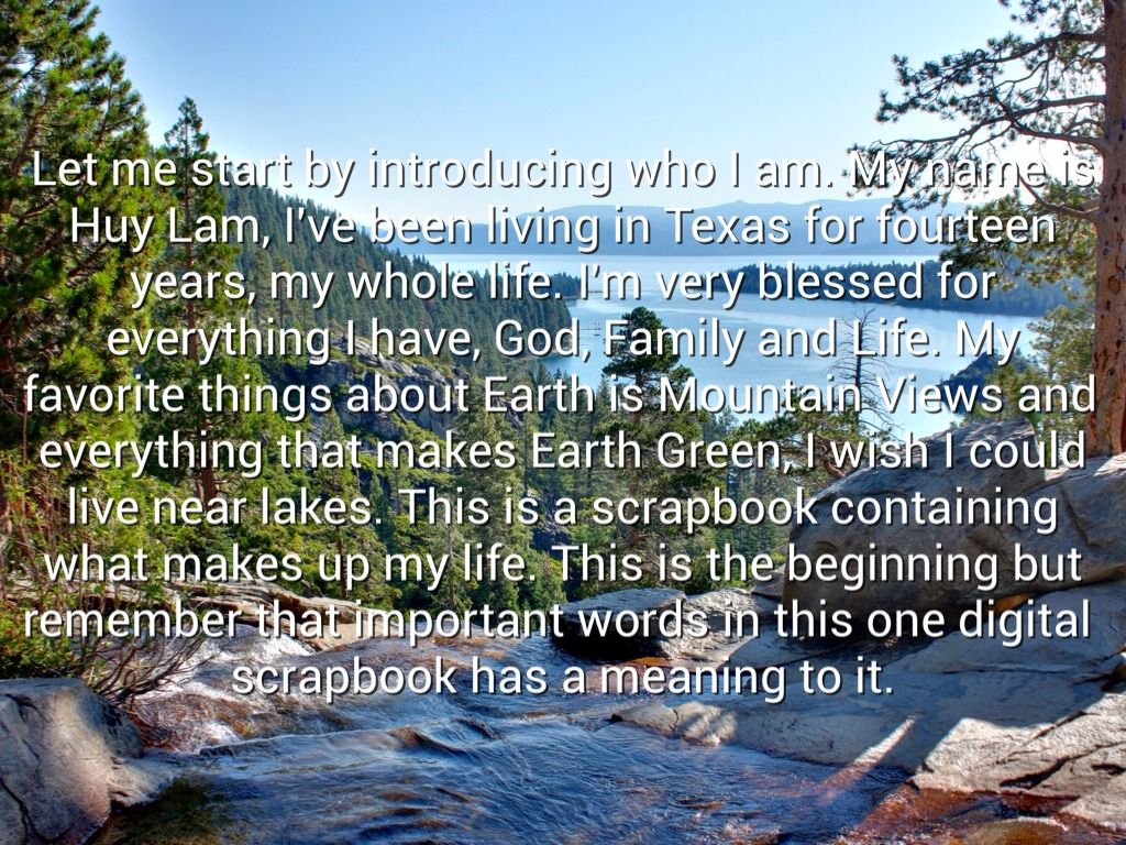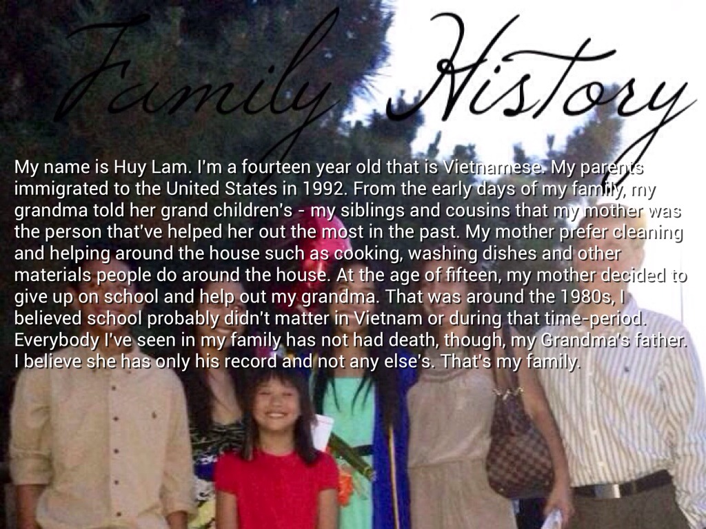 My name is Huy Lam. I'm a fourteen year old that is Vietnamese. My parents immigrated to the United States in 1992. From the early days of my family, my grandma told her grand children's - my siblings and cousins that my mother was the person that've helped her out the most in the past. My mother prefer cleaning and helping around the house such as cooking, washing dishes and other materials people do around the house. At the age of fifteen, my mother decided to give up on school and help out my grandma. That was around the 1980s, I believed school probably didn't matter in Vietnam or during that time-period. Everybody I've seen in my family has not had death, though, my Grandma's father. I believe she has only his record and not any else's. That's my family.
