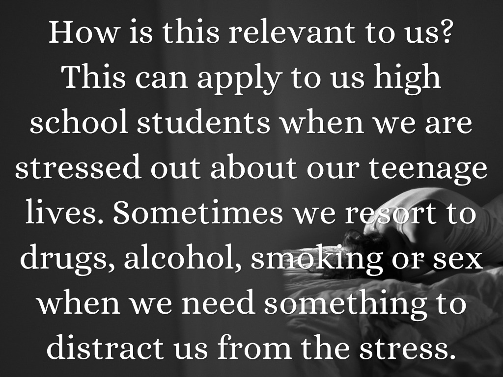 This can apply to us high school students when we are stressed out about our teenage lives. Sometimes we resort to drugs, alcohol, smoking or sex when we need something to distract us from the stress.