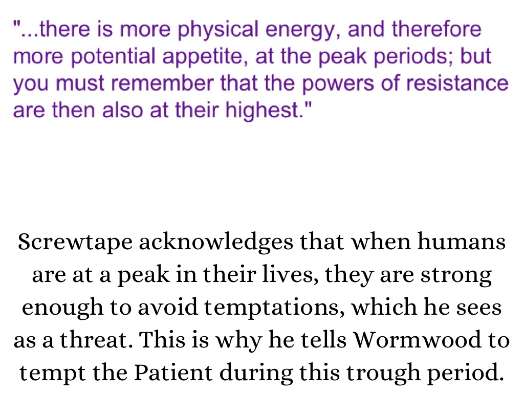 Screwtape acknowledges that when humans are at a peak in their lives, they are strong enough to avoid temptations, which he sees as a threat. This is why he tells Wormwood to tempt the Patient during this trough period.