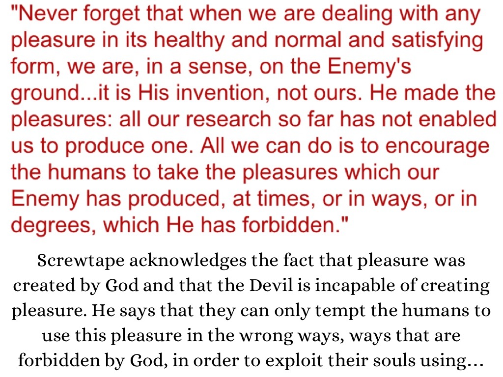 Screwtape acknowledges the fact that pleasure was created by God and that the Devil is incapable of creating pleasure. He says that they can only tempt the humans to use this pleasure in the wrong ways, ways that are forbidden by God, in order to exploit their souls using pleasure.
