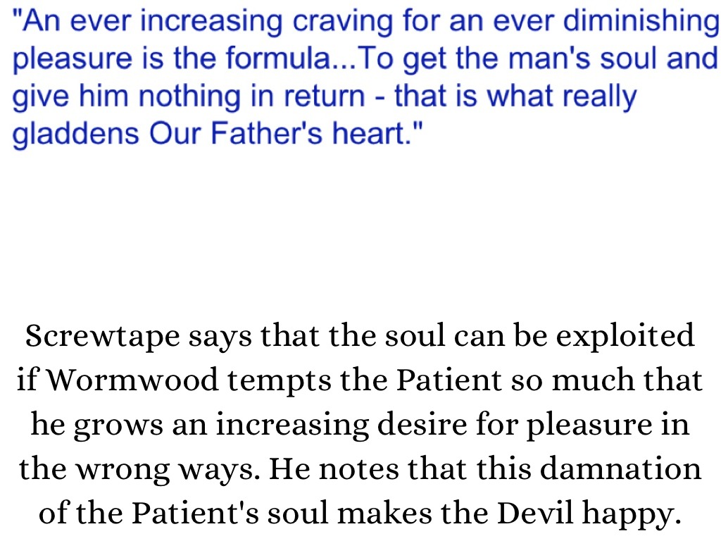 Screwtape says that the soul can be exploited if Wormwood tempts the Patient so much that he grows an increasing desire for pleasure in the wrong ways. He notes that this damnation of the Patient's soul makes the Devil happy.