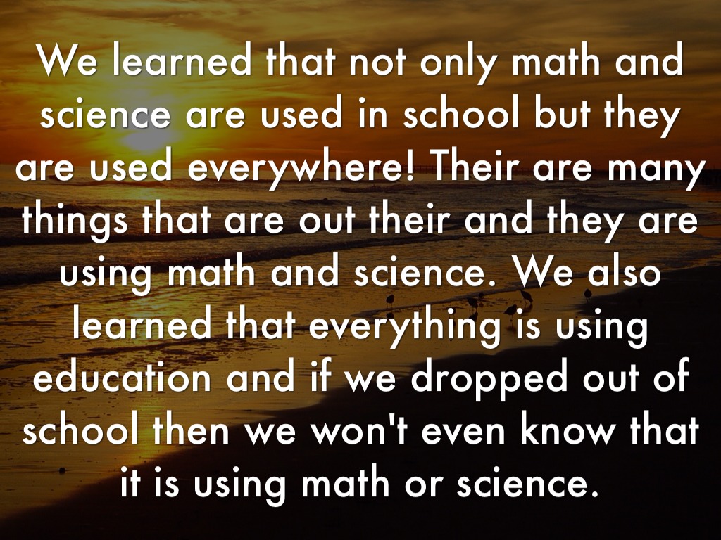 We learned that not only math and science are used in school but they are used everywhere! Their are many things that are out their and they are using math and science. We also learned that everything is using education and if we dropped out of school then we won't even know that it is using math or science.
