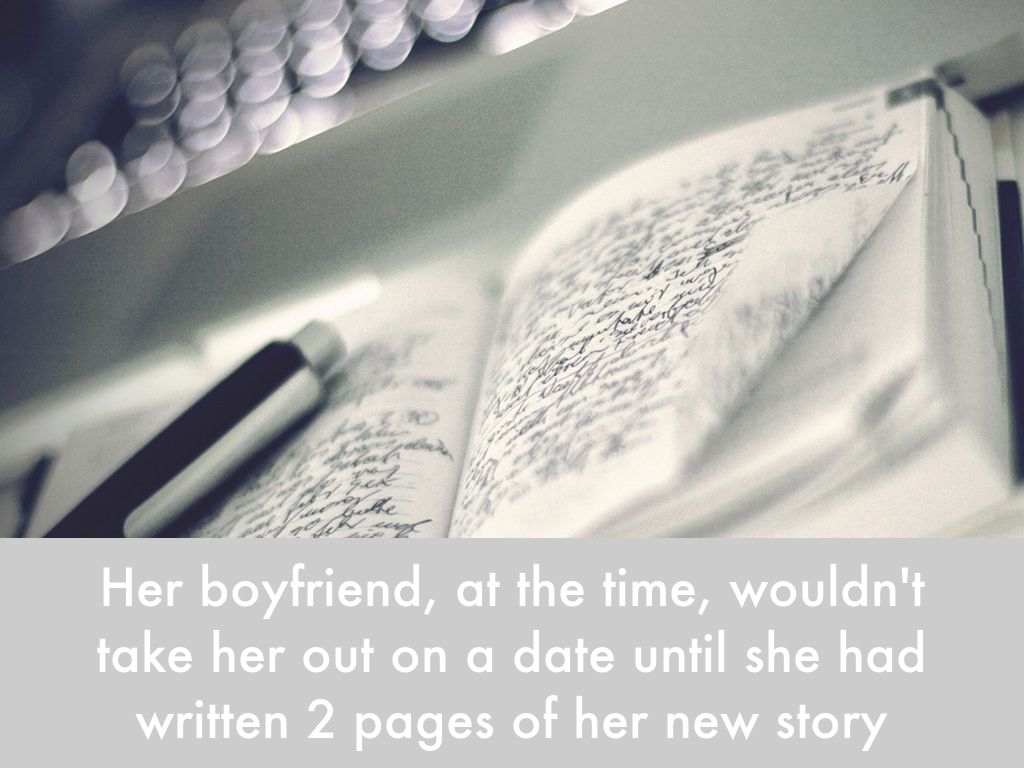 Her boyfriend, at the time, wouldn't take her out on a date until she had written 2 pages of her new story