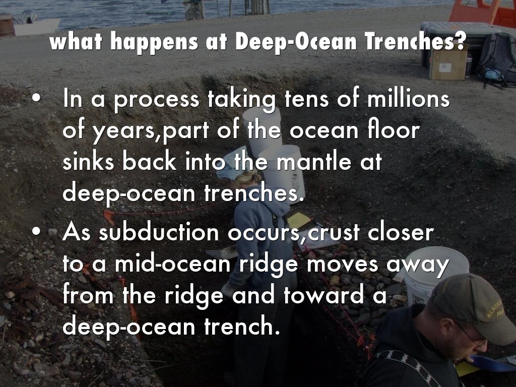 In a process taking tens of millions of years,part of the ocean floor sinks back into the mantle at deep-ocean trenches.