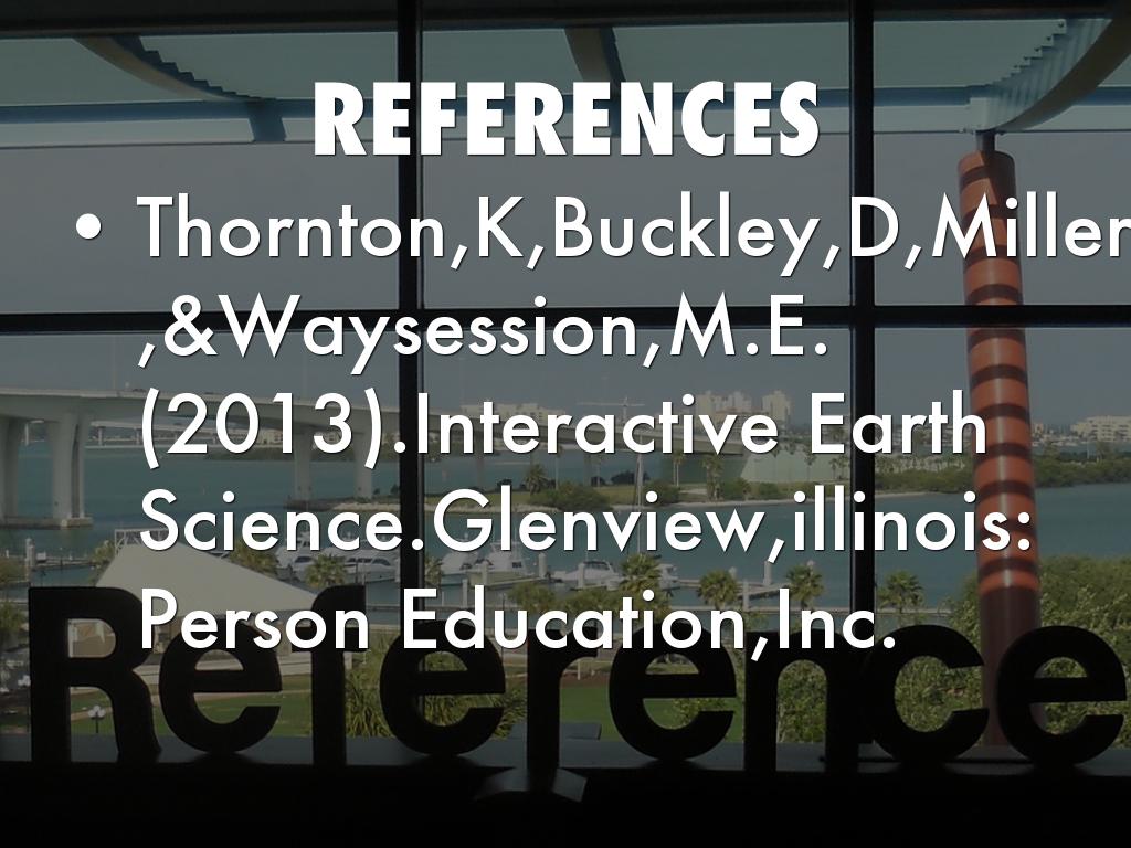 Thornton,K,Buckley,D,Miller,Z,padilla,M.J ,&Waysession,M.E.(2013).Interactive Earth Science.Glenview,illinois: Person Education,Inc.