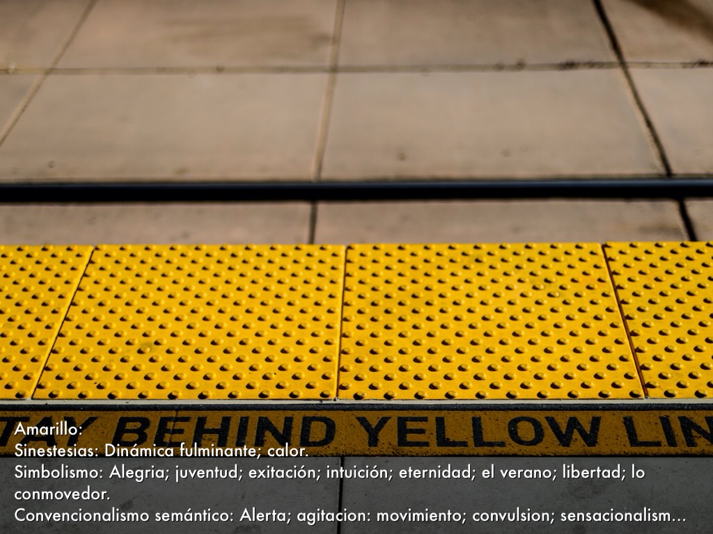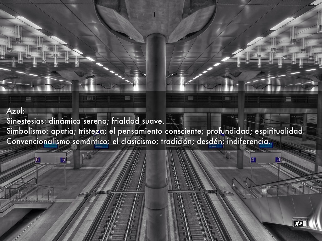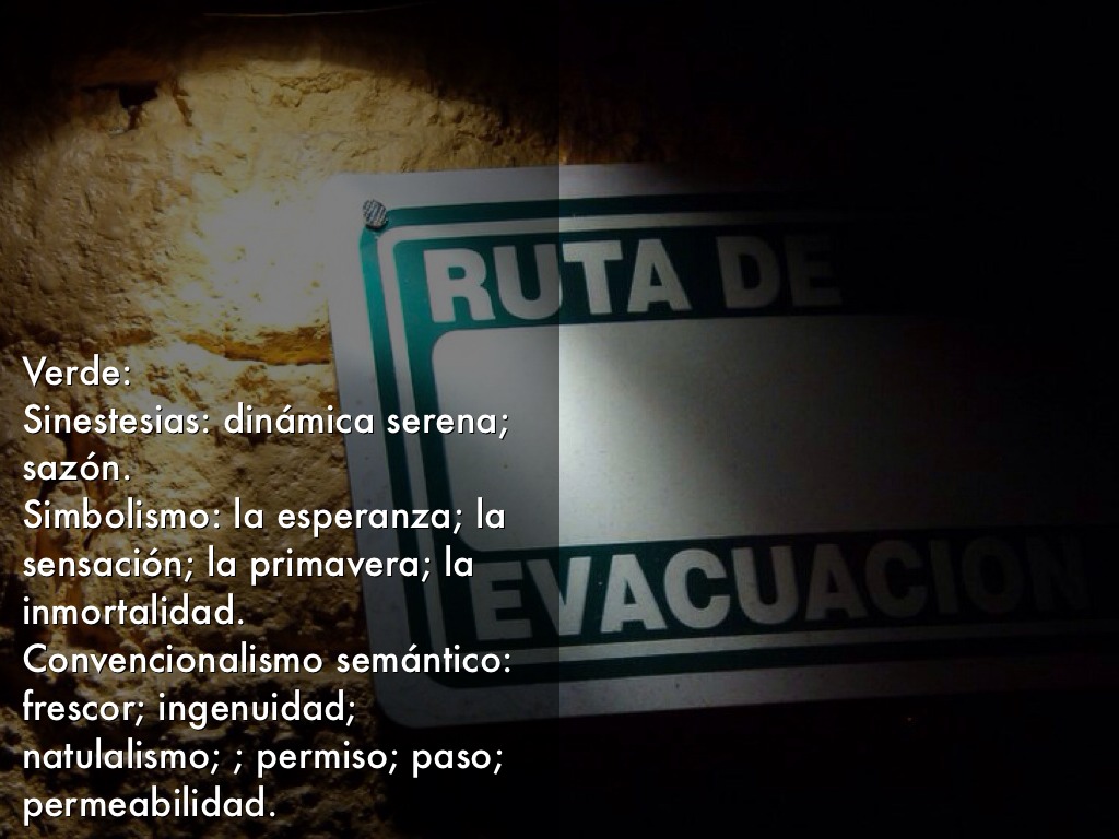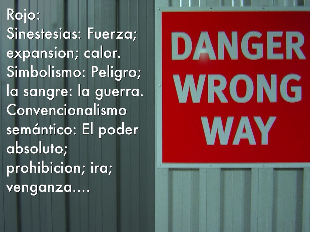 Rojo: Sinestesias: Fuerza; expansion; calor. Simbolismo: Peligro; la sangre: la guerra. Convencionalismo semántico: El poder absoluto; prohibicion; ira; venganza.