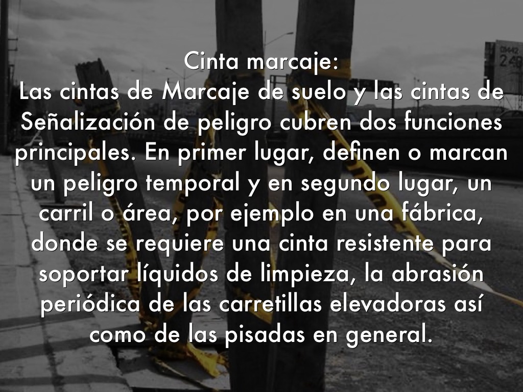 Cinta marcaje: Las cintas de Marcaje de suelo y las cintas de Señalización de peligro cubren dos funciones principales. En primer lugar, definen o marcan un peligro temporal y en segundo lugar, un carril o área, por ejemplo en una fábrica, donde se requiere una cinta resistente para soportar líquidos de limpieza, la abrasión periódica de las carretillas elevadoras así como de las pisadas en general.