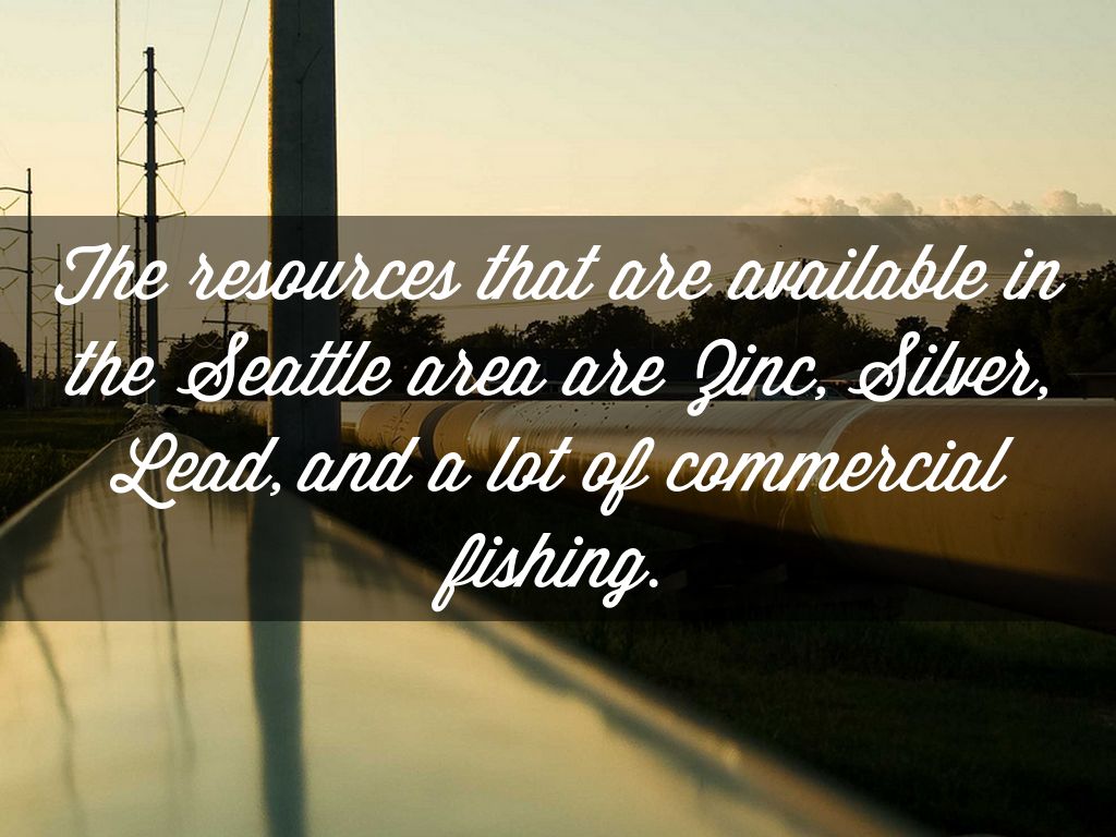 The resources that are available in the Seattle area are Zinc, Silver, Lead, and a lot of commercial fishing.