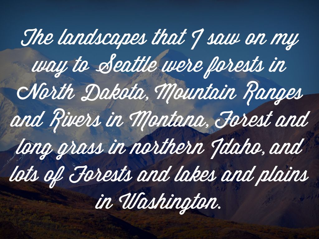 The landscapes that I saw on my way to Seattle were forests in North Dakota, Mountain Ranges and Rivers in Montana, Forest and long grass in northern Idaho, and lots of Forests and lakes and plains in Washington.