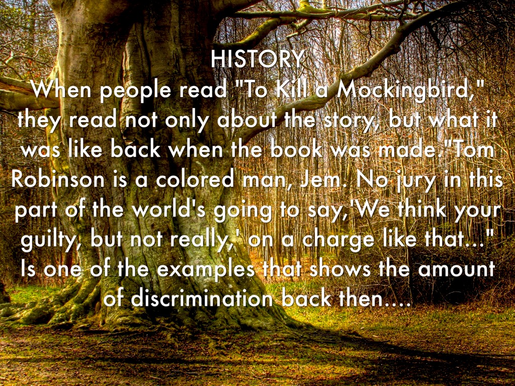 HISTORY When people read "To Kill a Mockingbird," they read not only about the story, but what it was like back when the book was made."Tom Robinson is a colored man, Jem. No jury in this part of the world's going to say,'We think your guilty, but not really,' on a charge like that..." Is one of the examples that shows the amount of discrimination back then.