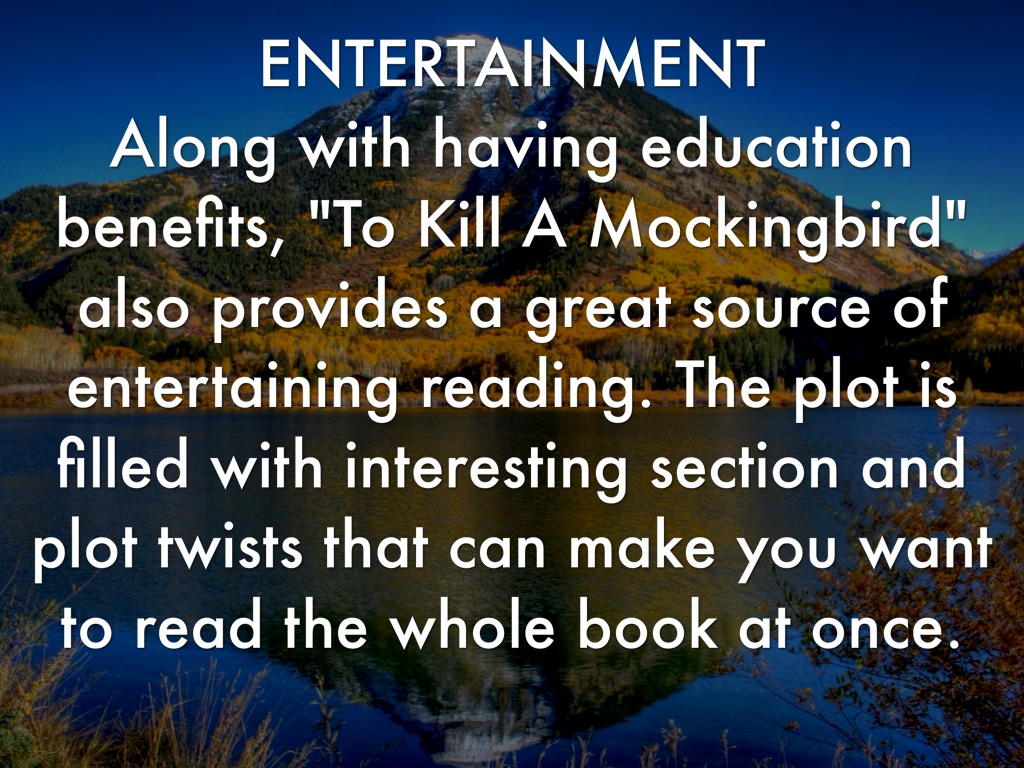 ENTERTAINMENT Along with having education benefits, "To Kill A Mockingbird" also provides a great source of entertaining reading. The plot is filled with interesting section and plot twists that can make you want to read the whole book at once.